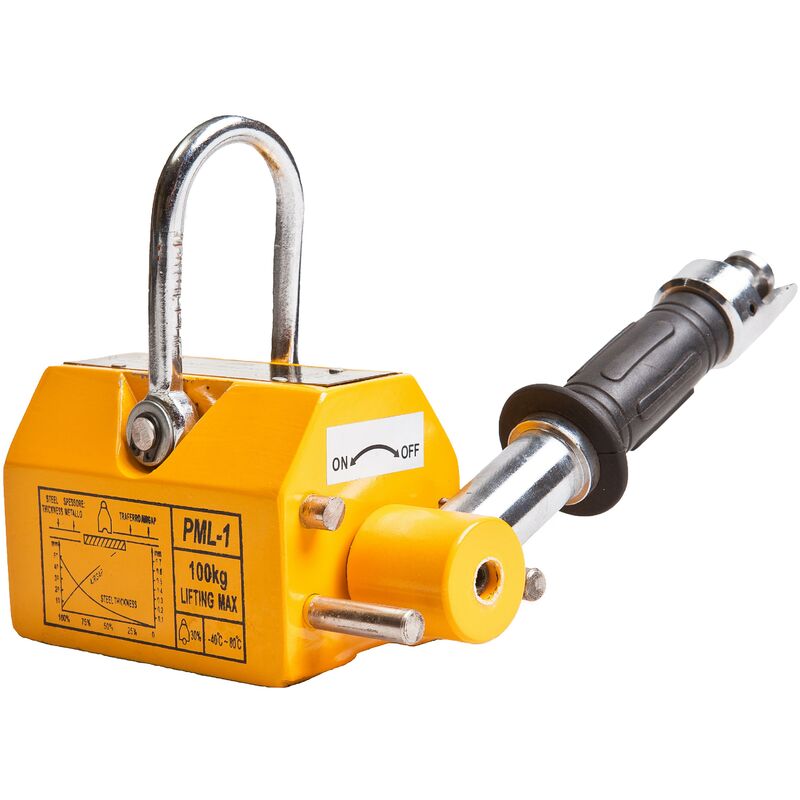 Per il sollevamento di elementi piatti e rotondi, soddisfa i requisiti della Direttiva Macchine e della norma PN-EN 13155, componenti verniciati a polvere, senza alimentazione esterna - accensione e spegnimento del pannello con una leva meccanica, maggiore attrazione nella tenuta d'aria, in magneti al neodimio, montaggio facile e veloce sui dispositivi di sollevamento, fattore di sicurezza 3:1, Campo di lavoro da -40 °C a +80 °C WLL (t) H (mm) W (mm) L (mm) I (mm) Gewicht(kg/szt) Flach Rohr T-PML 0,1 0,1 0,03 67 62 92 126 3 T-PML 0,3 0,3 0,1 91 92 162 155 10 T-PML 0,6 0,6 0,2 117 122 232 196 24 T-PML 1,0 1 0,3 163 176 258 285 50 T-PML 2,0 2 0,6 212 234 378 426 125 T-PML 3,0 3 1 261 286 458 521 220 T-PML 6,0 6 2 266 296 720 700 398