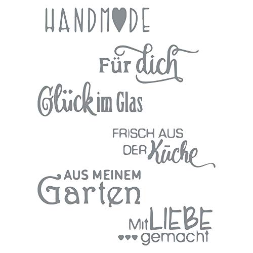 Il timbro a nastro include i seguenti testi: Handmade, Für Dich, Glück im Glas, Frisch aus der Küche, Aus meinem Garten, mit Liebe gemachtt