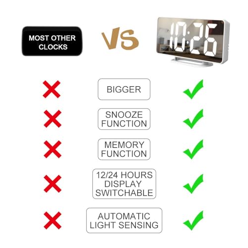 Sveglia con funzione snooze e memoria: il grande pulsante snooze aiuta a spegnere facilmente il cicalino senza aprire gli occhi, e ottenere 5 minuti di sonno in più, ma allo stesso tempo previene il sonno eccessivo. La cella a bottone CR2032 integrata può memorizzare tutte le impostazioni (ora, luminosità, modalità 12/24) anche l'orologio spento, non c'è bisogno di resettare tutte le impostazioni una volta che l'orologio tornerà all'accensione.