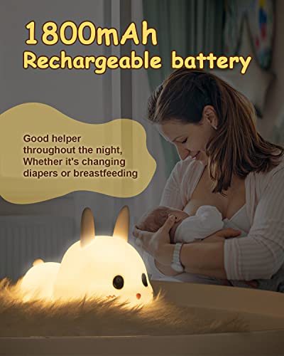 Facile da Controllare: L'interruttore ON/OFF si trova nella parte inferiore della luce notturna del coniglio. Inoltre, il pulsante del tempo è accanto al pulsante di spostamento. Dopo aver aperto la luce notturna neonato, toccando leggermente la luce notturna neonato, questa lampada bambini può facilmente cambiare il colore. 7 colori e 5 luminosità possono essere regolati toccando la lampada notturna. Inoltre, un telecomando è incluso.
