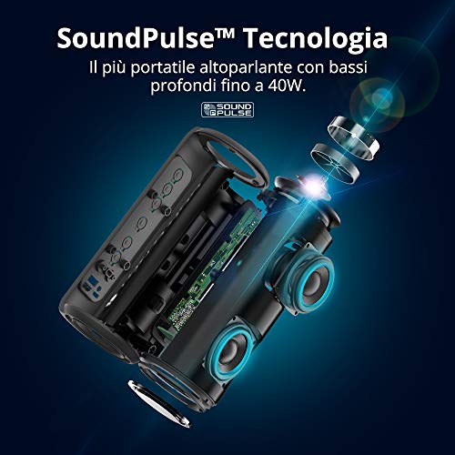♫ 40 Watt Subwoofer & IPX6 Waterproof ♫ Con l'esclusiva uscita ad alta potenza brevettata di Tronsmart SoundPulse™ 40W, il suono è frizzante e il basso è forte. In combinazione con il grado di impermeabilità di IPX6, esso si adatta a qualsiasi situazione, come viaggi all'aperto, spiaggia, piscina, doccia, festa, ecc.