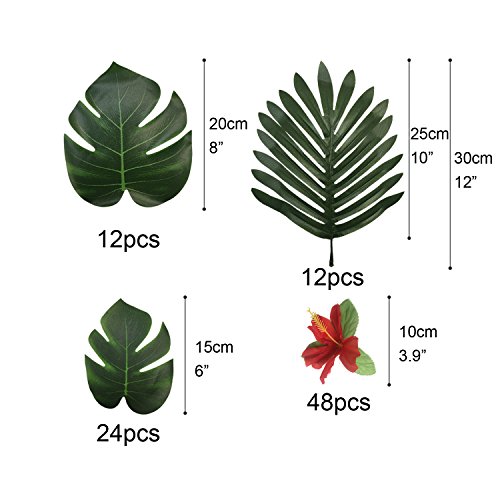 Contenuto della confezione: 36 foglie di monstera foglie in 2 taglie + 12 foglie di palma tropicale + 48 fiori di ibisco in seta. Realizzate in poliestere leggero e plastica, non tossico, confortevole al tocco, resistente e riutilizzabile.