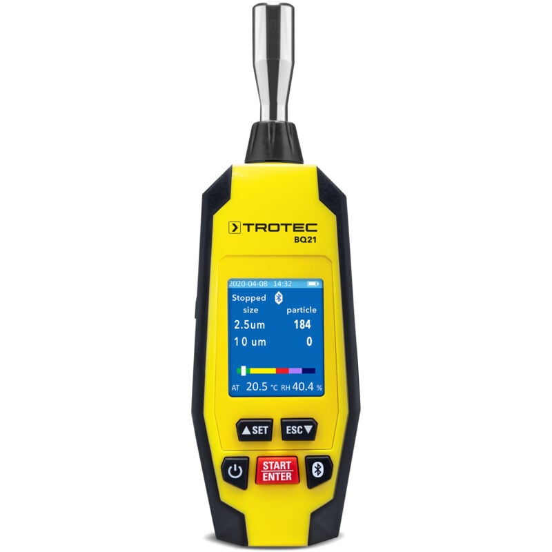 La misurazione delle particelle protegge dipendenti, clienti, ospiti e studenti L'eccessiva esposizione alla polvere sul posto di lavoro non solo mette in pericolo la salute dei dipendenti e dei colleghi, ma anche i prodotti da lavorare, le scorte e le attrezzature tecniche soffrono dell'aumento delle concentrazioni di particelle nell'ambiente. Per questo motivo, molti paesi hanno introdotto ora limiti legali per le concentrazioni di polveri sottili, il cui rispetto deve essere controllato regolarmente, soprattutto sul posto di lavoro, ma anche nelle scuole, negli asili, nelle case di cura e negli enti pubblici. Il controllo della qualità dell'aria diventa una cosa semplice: BQ21 con connettività Bluetooth ® Con l'intelligente dispositivo portatile Bluetooth® BQ21, è possibile tenere d'occhio il carico di particelle nell'aria ambiente anche per lunghi periodi di tempo. Il misuratore di particelle, con una memoria flash per 5.000 dati, registra tutti i parametri climatici interni