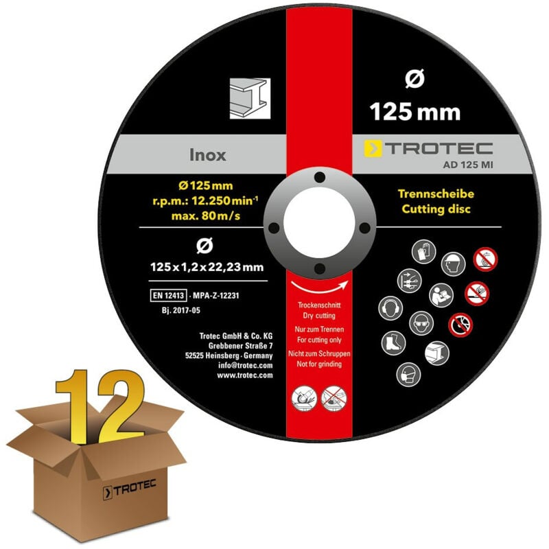 Durante la lavorazione dell'acciaio senza ruggine o dell'acciaio inossidabile con la smerigliatrice angolare manuale, è assolutamente necessario che la composizione dell'abrasivo dei dischi separatori sia esente da ferro, zolfo e cloro, per evitare che si formi ruggine sui bordi di taglio. Quindi quando scegliete i dischi separatori andate sul sicuro e, per la lavorazione dell'INOX, optate per il disco separatore professionale per metallo AD 125 MI nella qualità verificata del marchio Trotec. Il disco AD 125 MI, utilizzabile con tutte le smerigliatrici angolari manuali, è un disco separatore per metallo INOX ad alte prestazioni a norma EN 12413 che vanta la qualità del marchio Trotec e dispone del certificato di controllo MPA, e grazie alla grana 60, alla durezza Q e alla larghezza di taglio di 1,2 mm è la soluzione ideale per tagli precisi e veloci nella separazione professionale di acciaio inossidabile, con una buona durata anche con l'acciaio normale. Al disco AD 125 MI è destinato