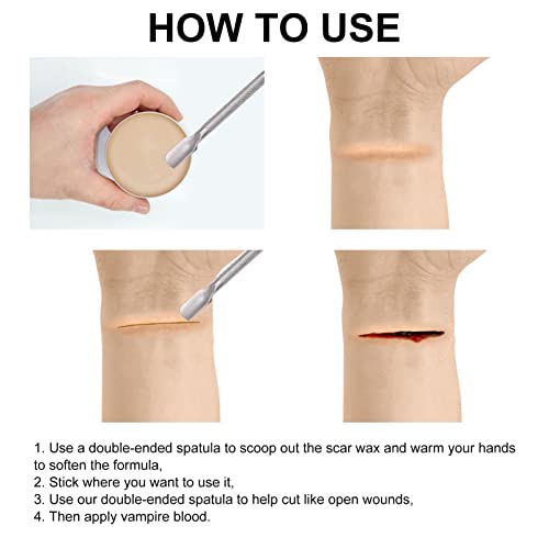 Il pacchetto include: questo kit per il trucco SFX per Halloween include 30 g di cera per cicatrici, 30 g di sangue finto e 1 raschietto.