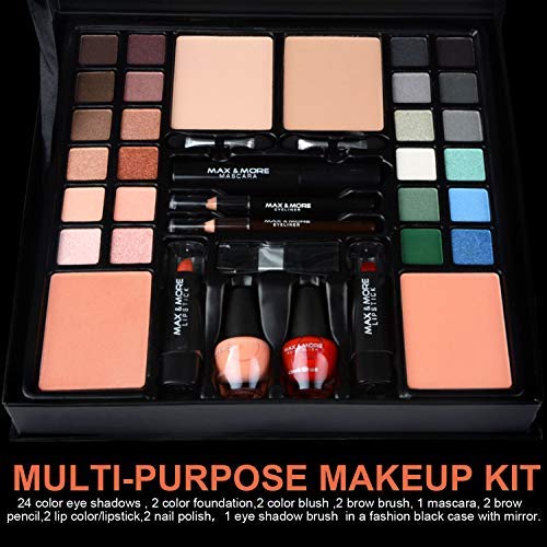 Kit trucco multiuso - Palette ombretto 24 colori, 2 fondotinta, 2 fard, 2 brow brush, 1 mascara, 2 eyeliner, 2 rossetti, 2 smalti per unghie, 1 pennello ombretto, 1 specchio in una custodia nera