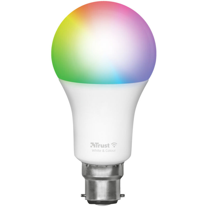 Trust 71282. Tipo: Lampadina intelligente, Interfaccia: Wi-Fi, Colore del prodotto: Bianco. Tipologia alimentazione: AC. Larghezza: 60 mm, Profondità: 60 mm, Altezza: 108 mm. Tipo di imballo: Scatola. Quantità per pacco: 1 pz Caratteristiche Tipo Lampadina intelligente Tipo di lampada LED Interfaccia Wi-Fi Colore del prodotto Bianco Attacco lampada B22 Forma della lampadina Forma ad A Colore variabile Sì Colore della luce Multi Temperatura del colore (min) 1800 K Temperatura del colore (max) 6500 K Flusso luminoso 806 lm Angolo proiezione 180° Color Rendering Index (CRI) 80 Fattore di potenza 0,5 Durata della lampadina 15000 h Dimmerabile Sì Range di dimmeraggio 10 - 100% Tempo di riscaldamento per raggiungere il 60% della luce 1 s Numero cicli di accensione 20000 Frequenza Wi-Fi 2,4 GHz Prestazione Supporto smartphone da remoto Sì Funziona con Amazon Alexa Sì Funziona con Google Assistant Sì Gestione energetica Tipologia alimentazione AC Dimensioni e peso Larghezza 60 mm Profondità
