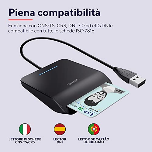 Trust Primo Lettore di Smart Card, DNI, Conforme con FIPS 201, FIPS TAA e ISO 7816 Classe A, B, C, Cavo di 100 cm, USB Plug & Play, Nero