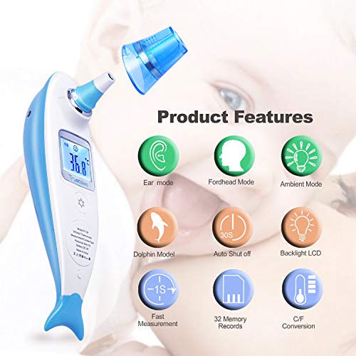 Trustown Termometro per orecchio e fronte, Termometro medico digitale per la febbre, Modello Dolphin 4 in 1 multifunzionale per bambino, adulto, ambiente e oggetto, approvato CE/ROHS/FDA