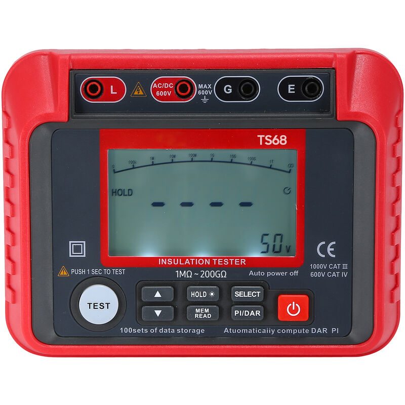 Questo è uno strumento multifunzione in grado di misurare la resistenza di isolamento, l'indice DAR e PI, la tensione CC e la tensione CA. Ha un aspetto alla moda e prestazioni stabili, può essere utilizzato per misurare macchinari elettrici, cavi, apparecchiature elettromeccaniche, apparecchiature per telecomunicazioni, impianti di alimentazione elettrica e altre resistenze di isolamento. Caratteristiche: Tester di resistenza di isolamento: questo strumento applica la funzione di rilascio automatico della tensione, con elevata stabilità e affidabilità, presenta un massimo di 2000 conteggi, 100 gruppi di memorizzazione dei dati e un intervallo di misurazione della resistenza di isolamento 1MΩ-200GΩ. Misurazione della tensione AC/DC -- La tensione di uscita nominale è variabile, è facile passare da 250 V/ 500 V/ 1000 V/ 2000 V/ 2500 V tramite il pulsante su/giù. Può misurare la tensione AC e DC con una gamma di 10-600 V. Funzionamento a batteria, con ampio display LCD digitale