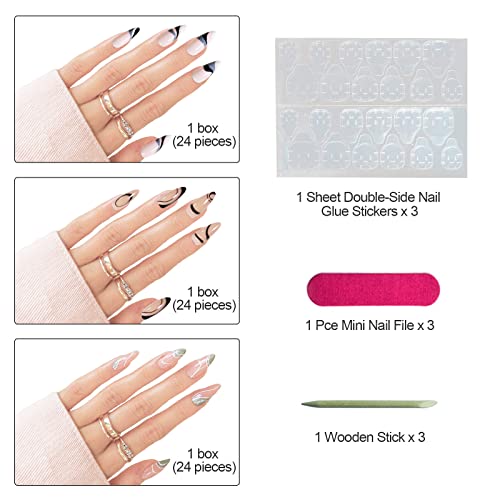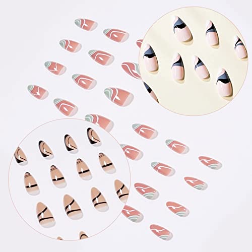 TSHAOUN 72 Pezzi 3 Confezioni Punta Francese Unghie Finte Linee Ondulate Nere Unghie A Mandorla Unghie Finte Copertura Completa Breve Presse Sulle Unghie Per Le Donne Ragazze Unghie Artistiche