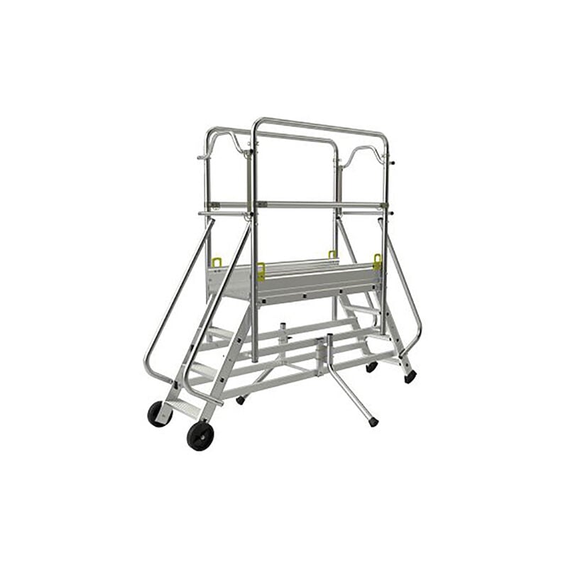 USO - Piattaforma per cantieri e lavori su larga scala. - Attrezzatura ideale per lavorare in spazi ridotti. - Piattaforma per lavorare tra i lati, che garantisce la massima sicurezza ai professionisti dell'edilizia. CARATTERISTICHE - Parapetto rigido e rimovibile per una sicurezza ottimale. - 2 rampe di accesso per un accesso sicuro e confortevole alla piattaforma. - Ampia piattaforma di lavoro, 1.22 x 0.43m. - Sottotraccia rimovibile per consentire un'area di lavoro più ampia. - Gradini in alluminio antiscivolo con profondità di 0.10m. - 4 anelli per gru per un rapido spostamento in cantiere. - 2 stabilizzatori indipendenti e retrattili per lavorare contro un muro o lungo una cassaforma. - 2 ruote Ø 160mm per un facile trasporto della piattaforma.