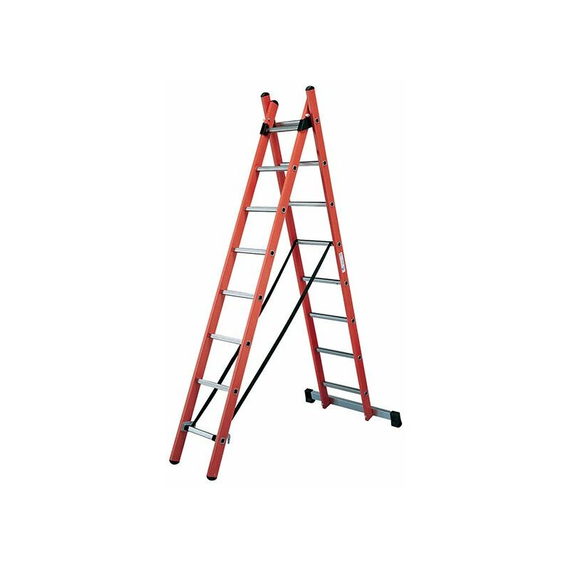 Sicurezza: - Vetroresina: isolante con tensione di rottura fino a 30000V. - Piedini montanti antisdrucciolo e cinghia anti-apertura accidentale - Collegamento montanti/piedini con crimpatura ad alta resistenza. - Base svasata con barra stabilizzatrice per una perfetta stabilità (da montare prima del primo uso) Comfort: - Scala in vetroresina/poliestere: lascia le mani pulite. - Scala polivalente: autostabile o da appoggio, con uso possibile anche su superficie irregolare. - Pioli 30 x 30 mm con passo di 280mm. - Sezione del montante: 66mm.