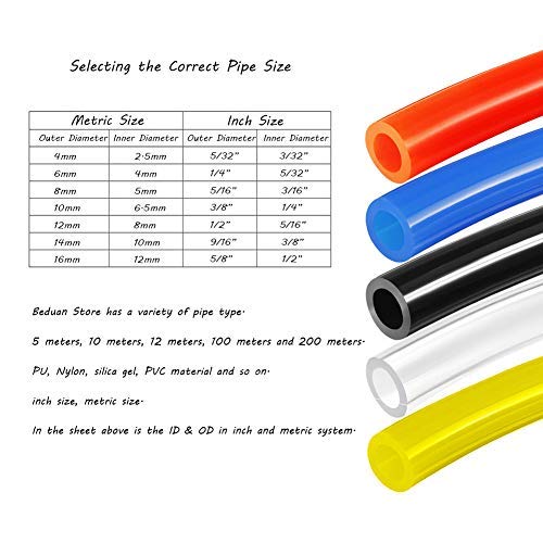 Dimensione del tubo in PU: 8 mm (diametro esterno) 5 mm (diametro interno), lunghezza totale della confezione: 12 piedi (12.19 m).