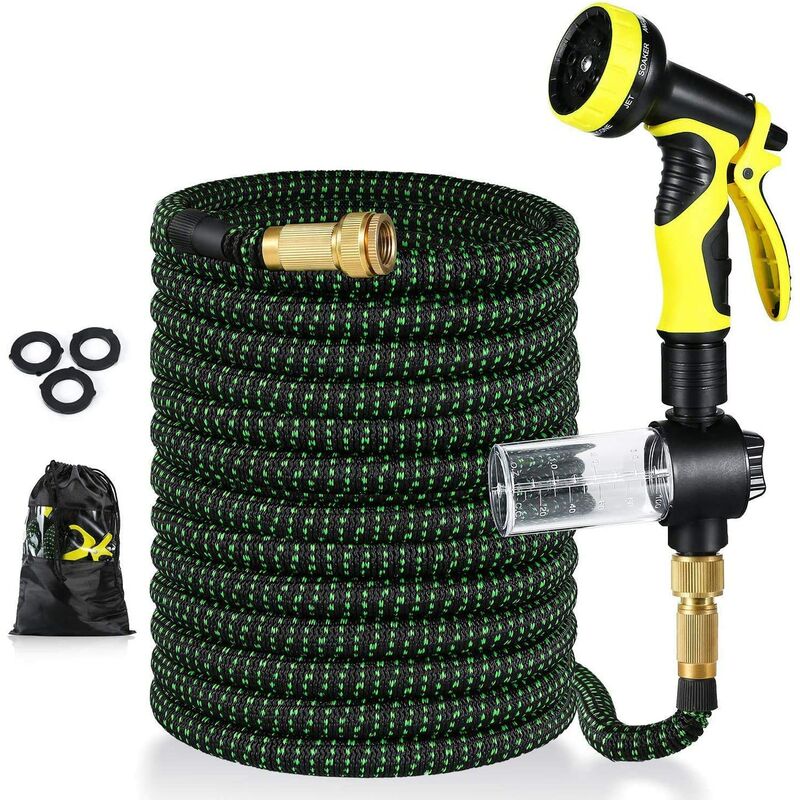 TUBO PER GIARDINO ESPANDIBILE - Materiale robusto premium di alta qualità il tubo flessibile dell'acqua espandibile può espandersi 3 volte alla sua lunghezza originale. Il design moderno funzionale aggiornato è flessibile e pieghevole e il più manovrabile. TUBO MAGICO - Nessun tubo da giardino è dotato di raccordi senza perdite standard 3/4 nichelati, doppio tubo in lattice e tessuto in poliestere elasticizzato. Il nostro tubo da giardino espandibile da non si aggroviglia e non si attorciglia. TUBO PER ACQUA ESPANSO - Il tubo flessibile da giardino espandibile inizia a una lunghezza di e si estende fino a con la pressione dell'acqua (3-12 bar) e si restringe alla sua lunghezza originale una volta che l'acqua è spenta. SPRAYER PER UGELLI PESANTI - Realizzato in metallo e dotato di 9 modalità di spruzzo uniche con proiettile della valvola di accensione / spegnimento. Ideale per annaffiare il prato e lavare la macchina e gli animali domestici senza spray o avvolgimento. Il tubo da