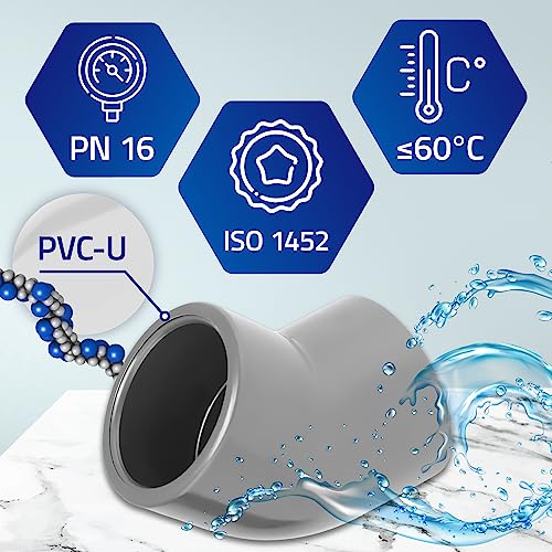 PVC-U sta per cloruro di polivinile non plastificato, un materiale termoplastico rigido e resistente. Tubo a gomito ha una classificazione di pressione PN 16. PVC raccordi sono generalmente progettati per temperature fino a 60°C.