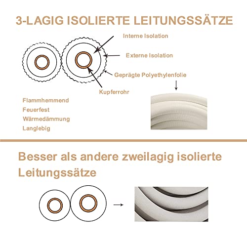 4M tube de cuivre de qualité sans soudre est isolant thermique et ne fuit pas,ligne à haute tension et ligne à basse tension. .Il convient aux climatiseurs mini-split dont le diamètre extérieur est de 1/4" (environ 0,6 cm) et 3/8" (environ 1,9 cm)et répond à la forme EN12735-1.