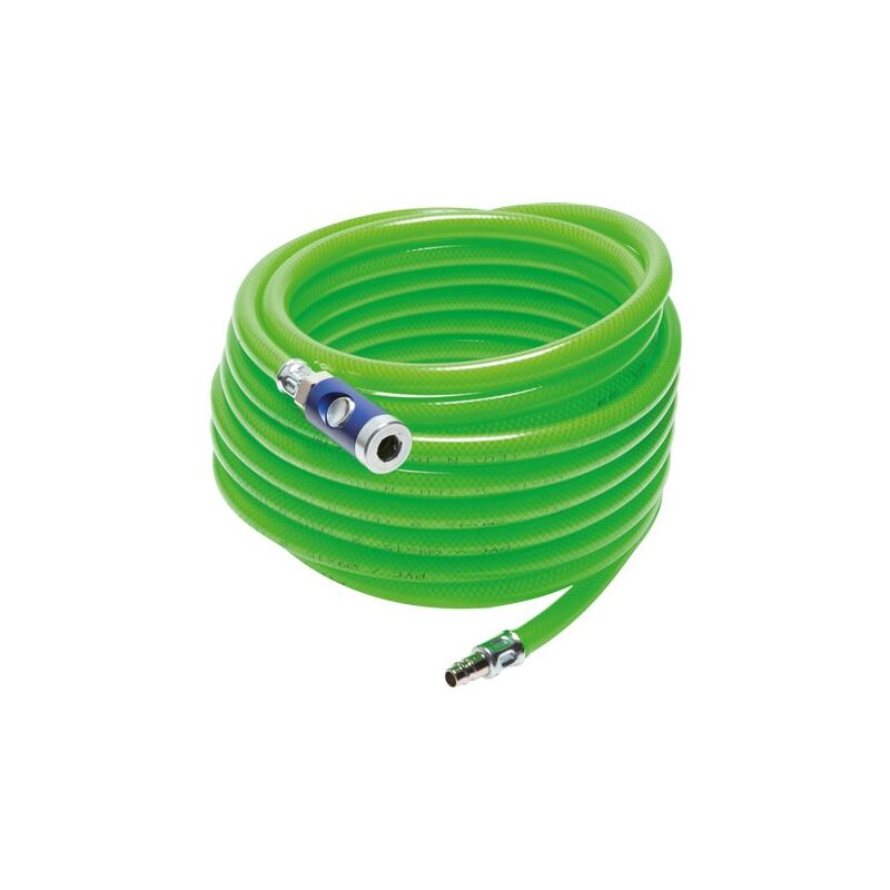 Materiali: Tubo: anima interna ed esterna in PVC con inserto in tessuto di qualità alimentare, testato TÜV, produzione priva di silicone, presa e tappo di accoppiamento: corpo in ottone con guarnizioni in NBR Intervallo di temperatura: -10°C a +60°C Fluidi: Aria compressa Altre caratteristiche: Versione Versione di sicurezza: verde luminoso con pulsante di sicurezza Ø interno del tubo (mm) 9 (3/8) Ø tubo esterno (mm) 15 Lunghezza del tubo (m) 20 Pressione di esercizio a 20°C (bar) 12 Peso 3 kg / pz.