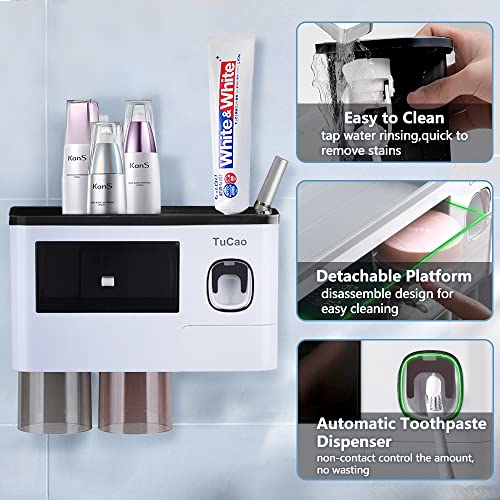 TuCao Dispenser automatico per dentifricio, con supporto a parete e porta spazzolino salvaspazio per bagno, 6 slot per spazzolino da denti con coperchio e cassetto organizer per cosmetici (2 tazze)