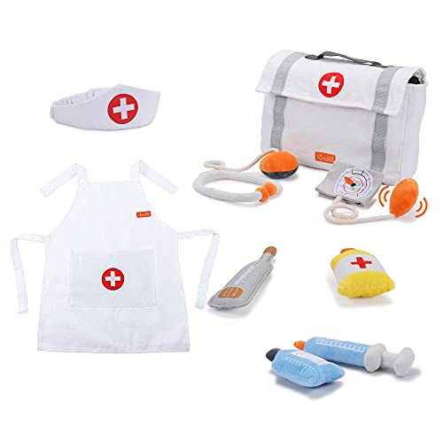 【Accessorio in materiale peluche morbido e sicuro】 A differenza di altri giocattoli medici in materiale plastico sul mercato, il nostro kit medico finto è realizzato in materiale morbido peluche per un uso duraturo, puoi anche giocarci a letto. Facile da pulire per la massima igiene. Nessuna parte tagliente in questo set, totalmente sicuro per i bambini, che non danneggerà i bambini.