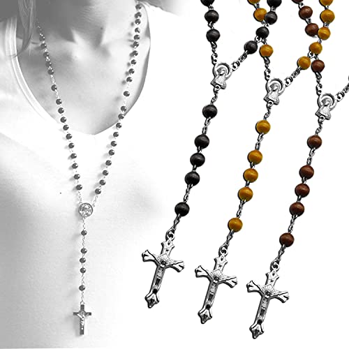 Tumundo Corona del rosario perle di legno 50 cm catenina collana pendente con croce nero marrone beige