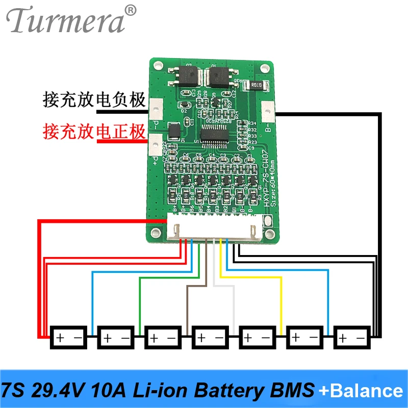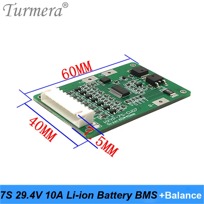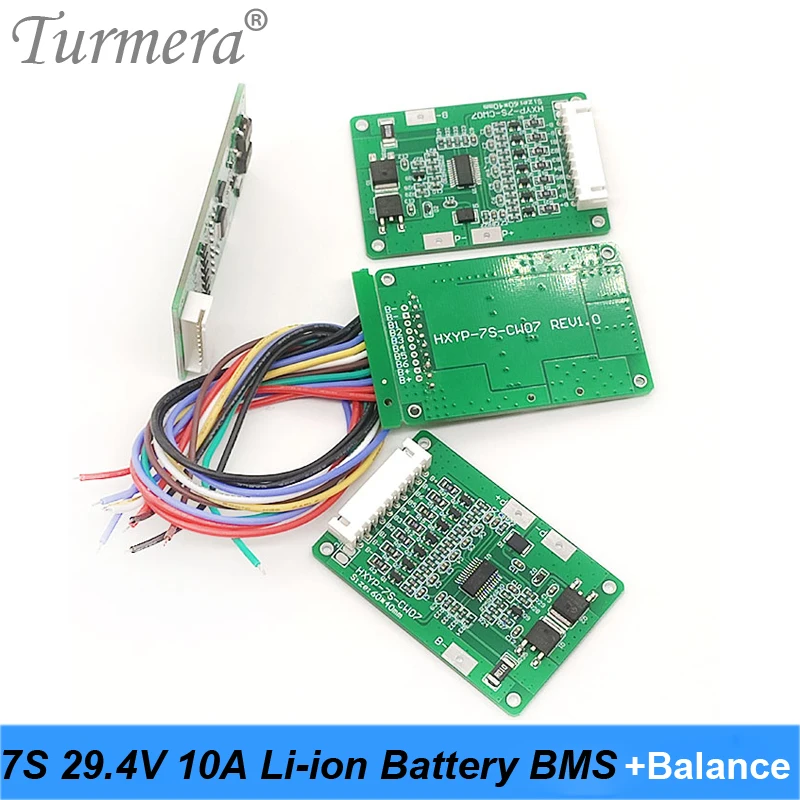 Turmera 7S 29.4V 25.2V 10A Lithium Battery BMS with Balancing and PCM Protection Board for E-scooter and Electric Bike Batteries