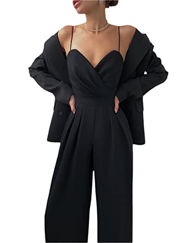 N /D Tuta da donna casual senza maniche a vita alta gamba larga tinta unita pagliaccetto con decorazione pieghettata, Nero, XL