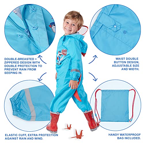 Tuta Impermeabile da Pioggia Resistente Bimbo 3/8 Anni - Completo Antipioggia Bambino Blu con Dinosauro e Dettagli Riflettenti - Poncho Giacca Pantalone con Cappuccio Bambini (Dinosauro, 7/8 Anni)