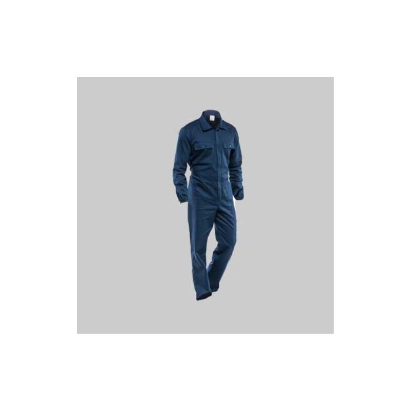 In tessuto 100% cotone, peso 240 g/m2, chiusura con cerniera in metallo, elastico in vita ed ai polsi, due tasche sul petto con bottone e pattina, due tasche laterali, tasca porta metro gamba destra, tasca posteriore chiusa con bottone. DPI 1a categoria, conforme UNI EN ISO 13688 (testato per la protezione contro le lesioni meccaniche superficiali). Colore blu navy. Tuta da lavoro tg. l Abbigliamento da lavoro invernale