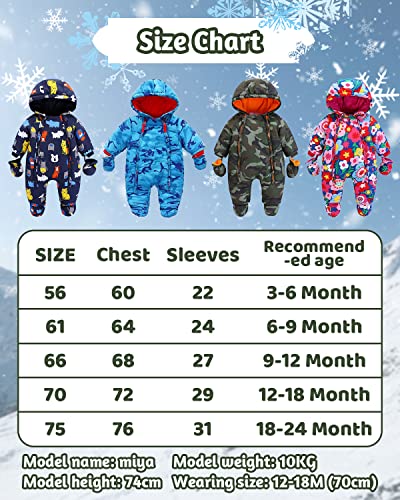 Design: il design con cerniera in un unico pezzo della tuta invernale neonato del bambino può essere indossato in un attimo per evitare che il bambino si raffreddi durante il cambio del pannolino, il motivo colorato e divertente dei cartoni animati è perfetto per i bambini e le bambine più carini, mentre viene fornito con guanti e copripiedi per dare al bambino più calore.