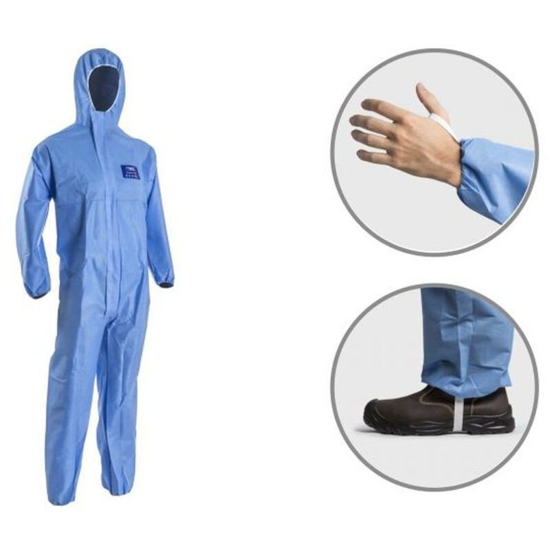 Caratteristiche: Cerniera con patta adesiva Efficace protezione contro particelle e schizzi di liquidi Cappuccio elasticizzato Cerniera con patta adesiva Composizione: Tessuti SMS 50 g/m² Standard: EN ISO 13688:2013 EN13982-2:2004 + A1:2010 TIPO 5 EN13034:2005 + A1:2009 TIPO 6 EN1149-5:2008 EN1073-2:2002: protezione contro la contaminazione radioattiva sotto forma di particelle