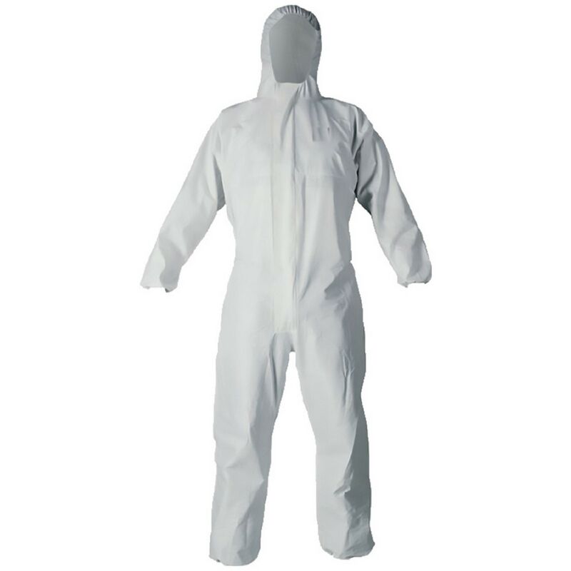 Per salvaguardia del corpo da rischi di lieve entitã . completa di cappuccio, chiusura con cerniera. elastico a polsi, caviglie, cappuccio. bordi cuciti con filo poliestere ricoperto di cotone. marcatura ce. categoria di protezione i (rischi minimi). peso