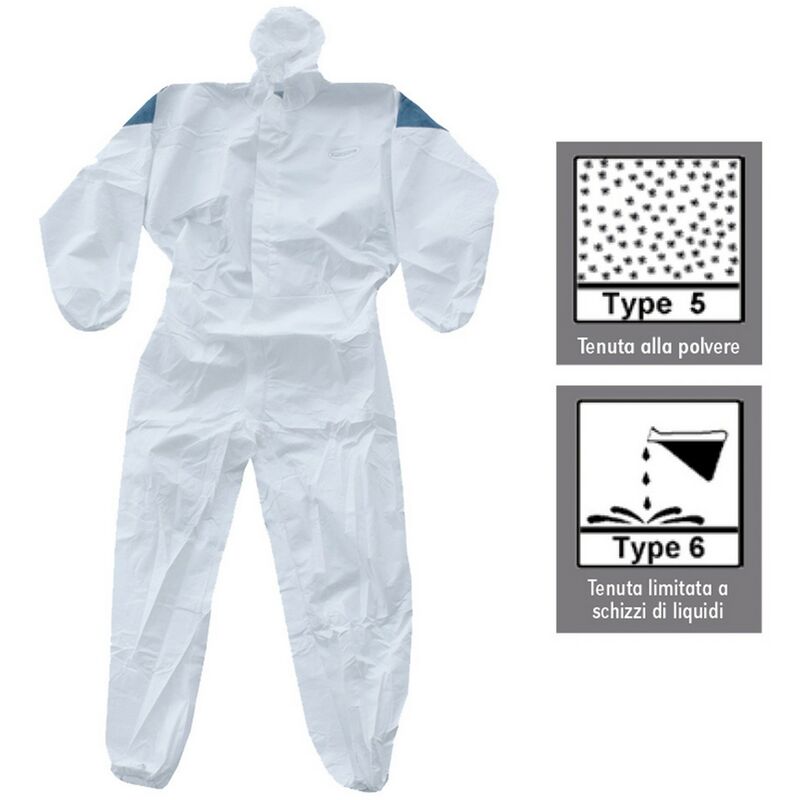 In puntiform, termosaldata senza cuciture. a protezione totale del corpo da aggressione chimica e tenuta alla polvere. tenuta limitata a schizzi di liquidi. categoria di protezione iii tipo nc (nucleare e chimica). proprietã antistatiche. colore bianco.x
