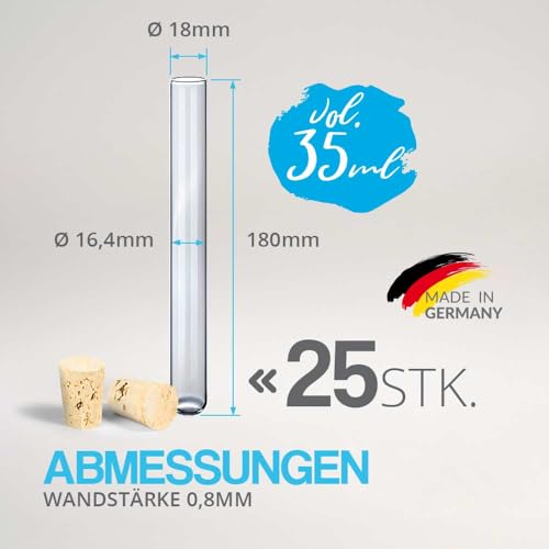 25 provette di massima qualità con tappi di sughero inclusi. ✓