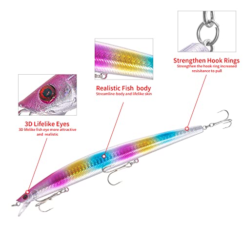 Ganci Speciali: I ganci triangolari affilati rendono difficile il disaccoppiamento per i pesci. Ha un laser a bilancia realistica sulla superficie, rivestimento squisito, può riflettere la luce da tutto il punto di vista, attirare meglio il pesce.