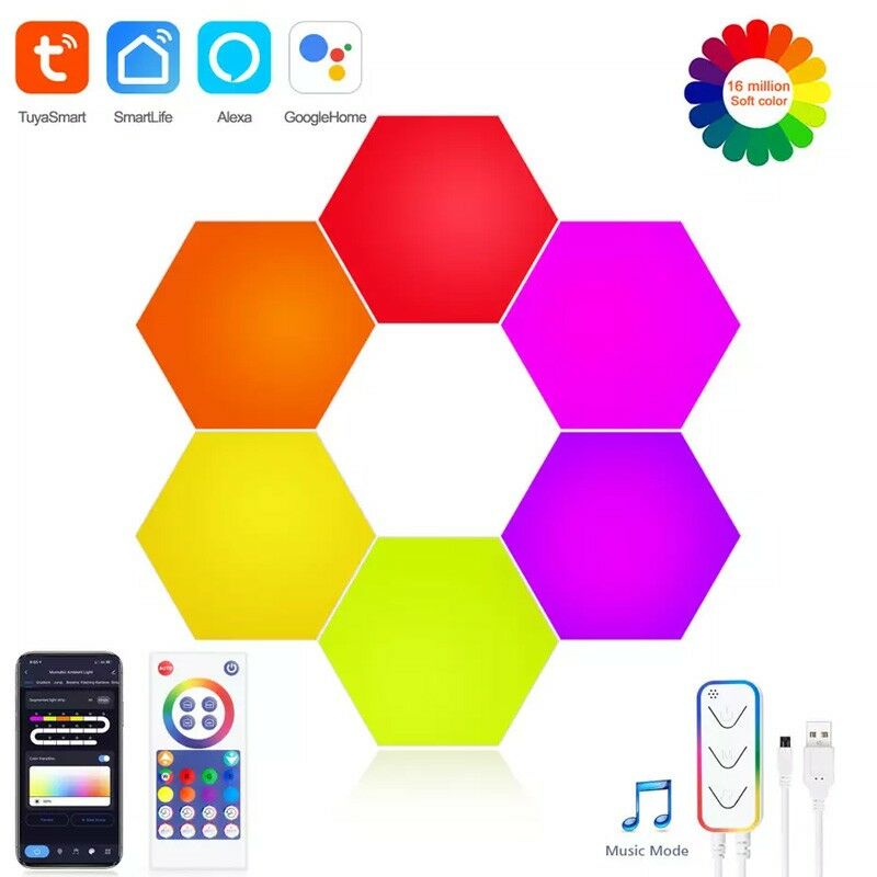 Tuya Luci Esagonali Modulari a LED Intelligenti WiFi Decorative RGBIC Pannelli luminosi esagonali Tuya, con cui puoi costruire rapidamente e facilmente una varietà di motivi, trasformando la tua parete in una tela brillante e le tue mani in un pennello per dipingerci sopra! Ideale per l'uso nell'arredamento della casa, nelle camerette dei bambini, nei set da gioco e in una varietà di altri luoghi. Controllo intelligente Con le nostre applique esagonali, avrai la possibilità di controllare le tue luci a led esagonali Rete WiFi da qualsiasi parte del mondo utilizzando le app Tuya Smat o Smart Life . Le luci esagonali intelligenti possono funzionare con Amazon Alexa e Google Assistant, puoi personalizzare la tua modalità tramite smartphone per cambiare i colori e la luminosità, anche per l'impostazione dell'ora che dipende da scene diverse. Fantastiche funzioni Tecnologia unica RGBIC fino a 16 milioni di colori e 70 effetti dinamici per colori fluidi e sfumati. La modalità di