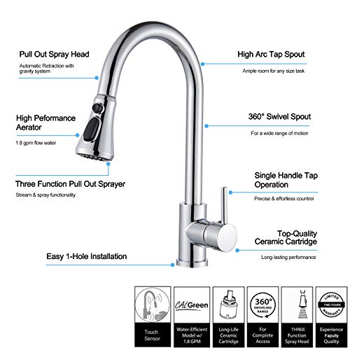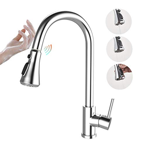 TVTIUO Rubinetto miscelatore per lavello da cucina con sensore touch a 3 funzioni, cromato con spruzzatore estraibile a manico singolo, in acciaio inox ad arco alto
