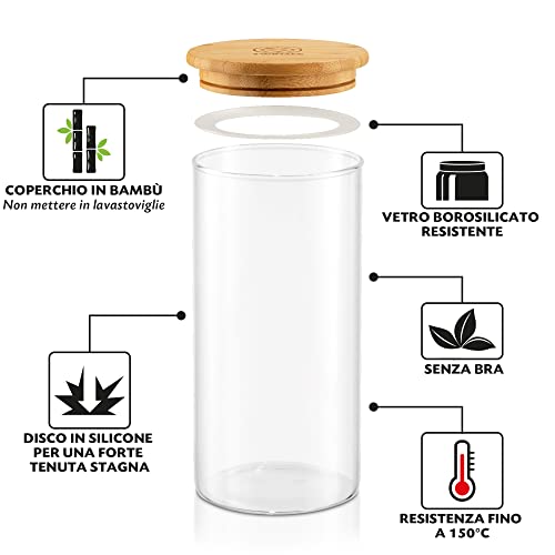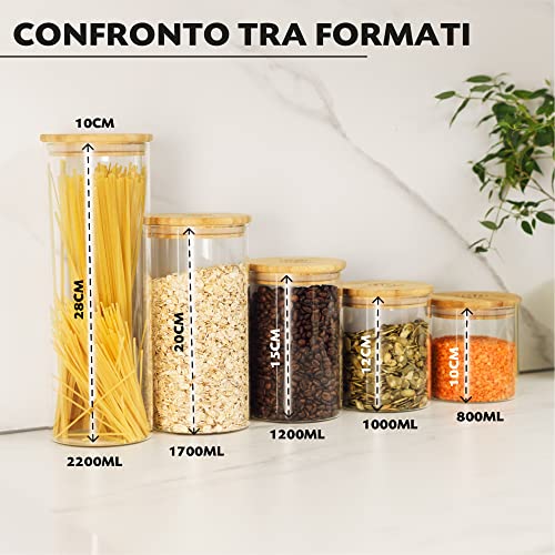 BARATTOLI VETRO ERMETICI MULTIUSO - 5 barattoli e contenitori vetro chiusura ermetica in diverse misure per organizzare la cucina: vetro borosilicato resistente, coperchio in bambù con guarnizione silicone senza BPA, vaso vetro trasparente ermetico 2,2L, barattoli di vetro con tappi 1,7L, 1,2L, 1 L, 800 ml