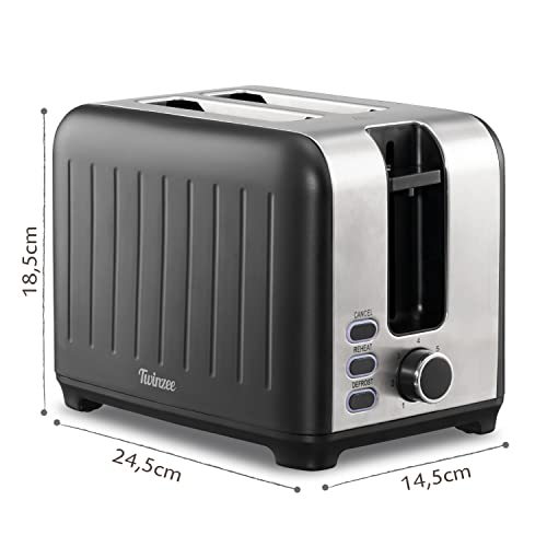Twinzee Tostapane Fenditura Larga 3 in 1 - Nero Opaco in Inox, Tostiera Vintage - Pinza in Bambù Gratis - 7 Livelli di Tostatura - 850W - Scalda Pane e Raccogli Briciole