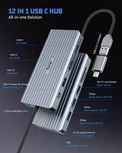 Hub USB C, Tymyp 12 in 1 Docking Station USB C Triplo Display con 2 * 4K HDMI, VGA, LAN Ethernet, 3* USB-A 3.0, USB-A 2.0, 100W PD, SD/TF, Jack da 3.5mm, Adattatore USB da A a C multiuso