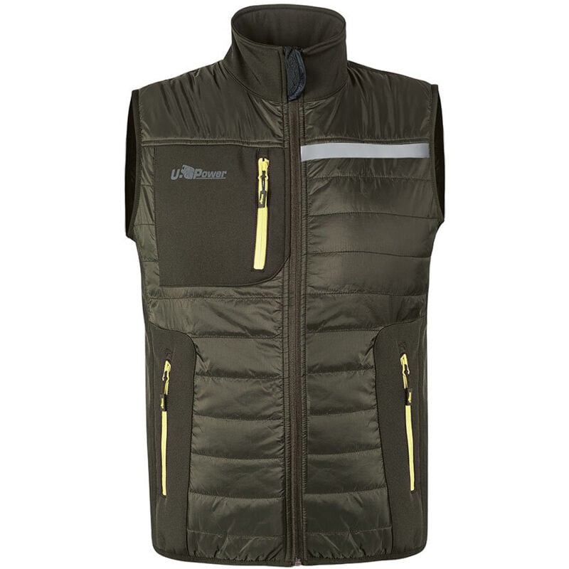 Il gilet da lavoro U-Power Wall FU278DG è un indumento professionale ideale per tutte le stagioni ed ogni ambiente lavorativo dinamico.Perfetto per mantenere la temperatura corporea ottimale, questo gilet è realizzato con imbottitura in grafene dalle eccezionali proprietà di termoregolazione. Infatti, questo indumento permette di disperdere il calore in caso di temperatura troppo elevata e di mantenerlo in caso di temperatura bassa, garantendo una sensazione piacevole e confortevole.Questo prodotto risulta idrorepellente e traspirante, oltre che antibatterico, offrendo anche un igiene migliorata anche per utilizzi prolungati durante l'arco della giornata.Il gilet da lavoro U-Power Wall FU278 è dotato di tasche frontali con chiusura a zip, tasca verticale con cerniera sul petto e tasca interna con chiusura a strappo, giro manica e fondo vita elasticizzato per una vestibilità migliorata.Il design sportivo presenta il logo U-Power sul lato destro del petto e la stampa della linea