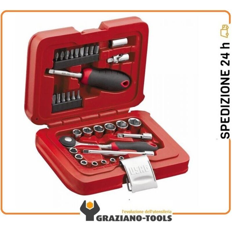 Caratteristiche assortimento Usag 601 1/4 j34: Contenitore compatto in materiale plastico Clip di aggancio in metallo Incluso cricchetto reversibile 1/4 con meccanismo a 72 denti e sistema di sgancio della bussola CHIUSA la cassetta può essere riposta in un cassetto H60 APERTA la cassetta occupa lo spazio di 1 modulo portautensili 13 Chiavi a bussola 1/4 con bocca esagonale 4-4,5-5-5,5-6-7-8-9-10-11-12-13-14 mm 2 Prolunghe 1/4 55-100 mm 1 Cricchetto reversibile 1/4 1 Impugnatura porta-bussole 1/4 1 Snodo cardanico 1/4 1 Bussola portainserti 1/4-1/4 3 Inserti 1/4 ad intaglio 4-5,5-6 3 Inserti 1/4 a croce PH 1-2-3 3 Inserti 1/4 esagonali maschio 4-5-6 mm 6 Inserti 1/4 TORX® T10-T15-T20-T25-T30-T40