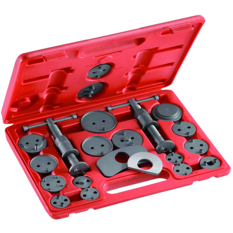 Assortimento per comprimere e ruotare i pistoncini dei freni a disco anteriori e posteriori Permette di riposizionare agevolmente i pistoni del freno nell'alloggiamento della pinza Include 2 mandrini con rotazione destra e sinistra e da diverse piastre, adattatori e accessori Peso 2,6 Kg 2800 S21 VALIGETTA FRENI