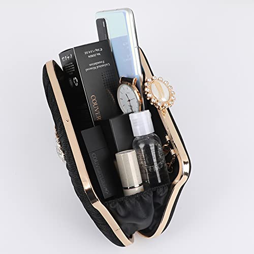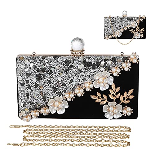 UBORSE Borsetta da Sera Donna Pochette Elegante Clutch Piccolo con Catena, Finitura Fiore di Perla, Borsa a Tracolla per Cocktail Festa Ballo Cerimonia, Nero