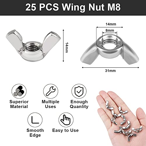 UCNOGIM 25 Pezzi Dadi ad Ala in Acciaio Inox M8 Dado a Farfalla M8 Dadi a Galletto Kit di Fissaggio Dadi ad Alette Kit Dadi ad Alette a Farfalla 31 * 14CM per Fissaggio Strumenti Fai-Da-Te, Argento