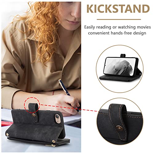 UEEBAI Custodia per iPhone SE 2022 5G/iPhone 7/iPhone 8/iPhone SE 2020, 9 slot per schede portafoglio antiurto flip cover cinturino slot per carte con cerniera tasca per iPhone SE3/SE2 -Retro nero