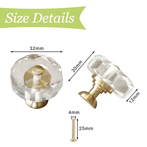 UFURMATE Pomelli in cristallo di vetro, 6 pomelli per armadietti e cassetti, pomelli in vetro con diamanti in ottone dorato per mobili (3,2 x 3 cm)