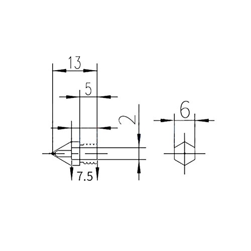 Dimensioni. Diametro dell'ingresso: 1,75 mm. Diametro dell'uscita: 0,4 mm. Lunghezza dell'ugello in ottone: 13 mm. Diametro dell'esagono: 6 mm.