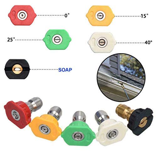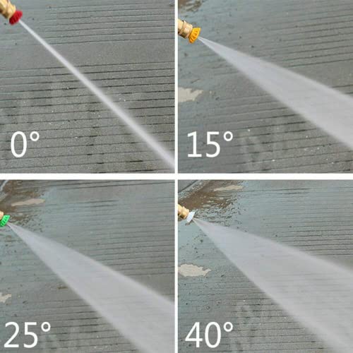 【Multi ángulo】 Elija diferentes ángulos de boquilla según sus necesidades. 1 boquilla de acero inoxidable rojo (0 grados), 1 boquilla de acero inoxidable amarillo (15 grados), 1 boquilla de acero inoxidable verde (25 grados), 1 boquilla de acero inoxidable blanco (40 grados), 1 boquilla de jabón de latón (65 grados).