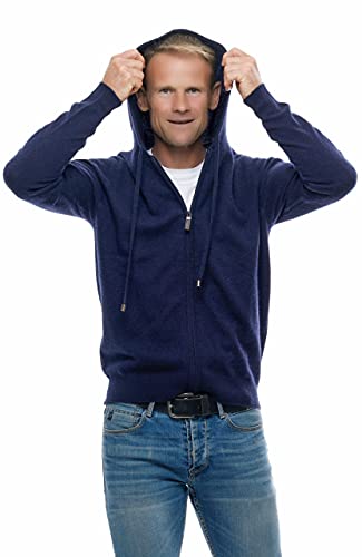 Ugholin Uomo Cardigan 100% Puro Cashmere con Cappuccio e Zip, Blu Marino, XL